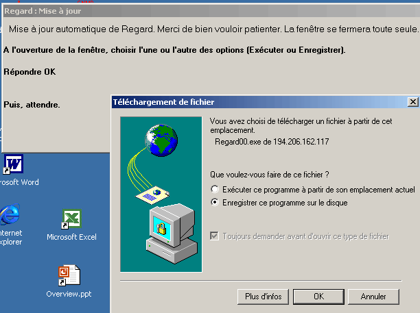 Regard s’installe sous windows 98 de la même façon que sous les autres systèmes d’exploitation mais les fichiers (setup) sont différents. Pour installer c’est la même procédure que pour les autres systèmes d’exploitation sauf que les fichiers sont différents et qu’il faut répondre aux messages possibles suivants :